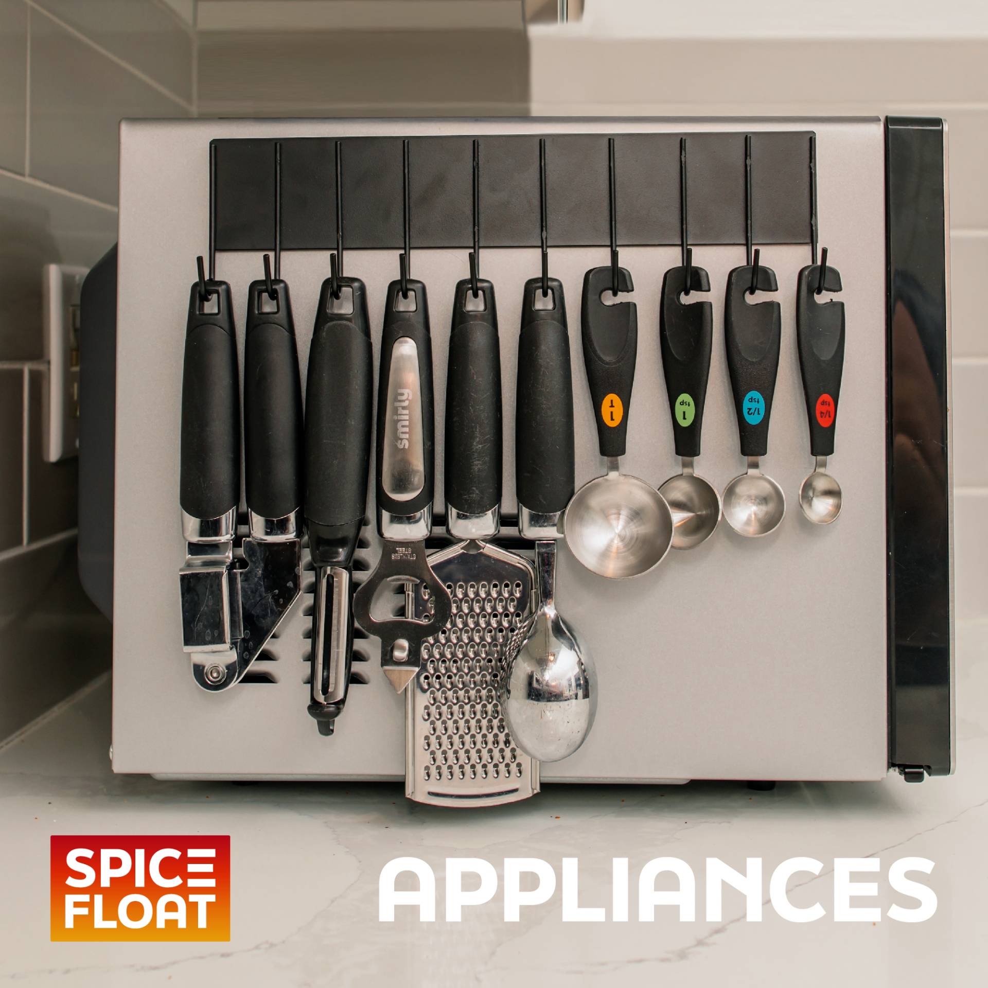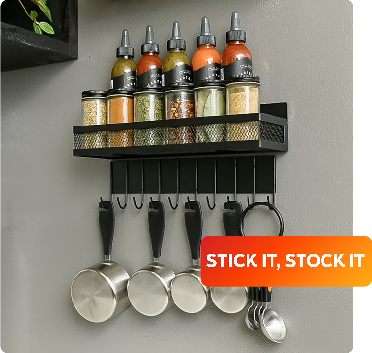 - Hanging Hooks Keep Vital Utensils Within Easy Reach: In addition to abundant shelf space for storing sauces and spices, each Spice Float set comes with a 10-hook bar for keeping potholders, utensils, measuring cups, and bagged produce within reach.