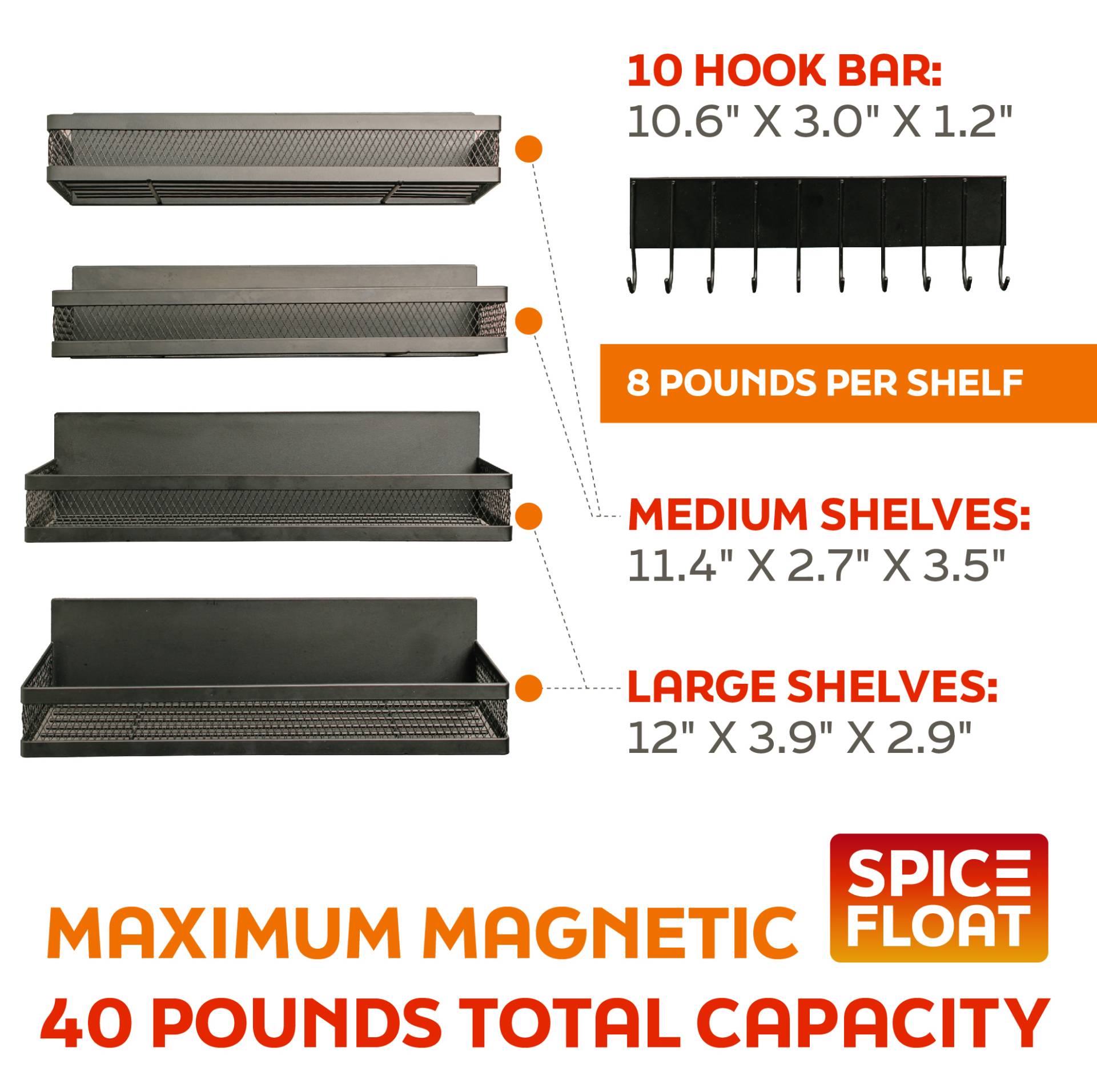 - Magnetic Shelving System Supports Your Ingredient Overflow: Each Spice Float Magnetic Shelf set comes with 4 storage racks that can hold up to 8 pounds of spices, oils, sauces, dry rubs, and more.